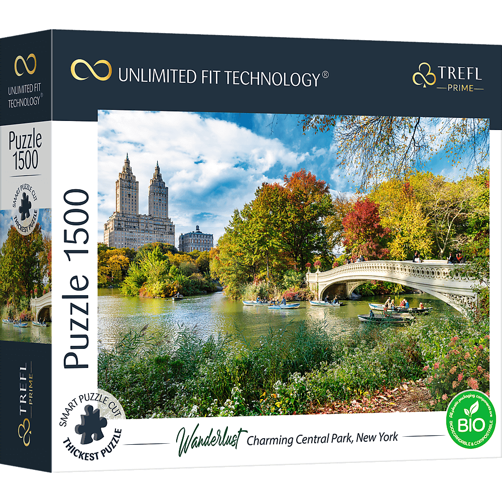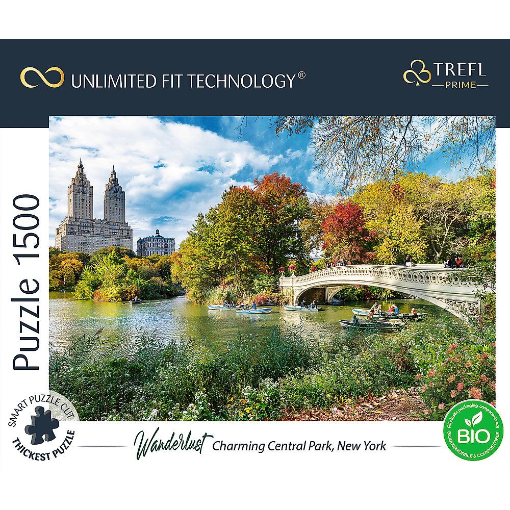 Головоломки з серії Trefl Prime Unlimited Fit Technology, що складається з 1500 елементів, присвячені справжнім любителям головоломки. Головоломка зображує Центральний парк у Нью -Йорку. Після прокладки буде створено зображення розміром 850x580 мм.Головоломки були виготовлені з високоякісних матеріалів, використовуючи найгустіший картон, унікальні форми та спеціальний метод різання. Завдяки цьому ми можемо створити індивідуальний колаж і легко перемістити всю головоломку. Крім того, окремі елементи продукції UFT виготовлені з екологічних матеріалів. Сумка жолоба та наклейки на коробці були виготовлені з біологічно розкладаної фольги. Продукти не загорнуті в теплову фольгу.