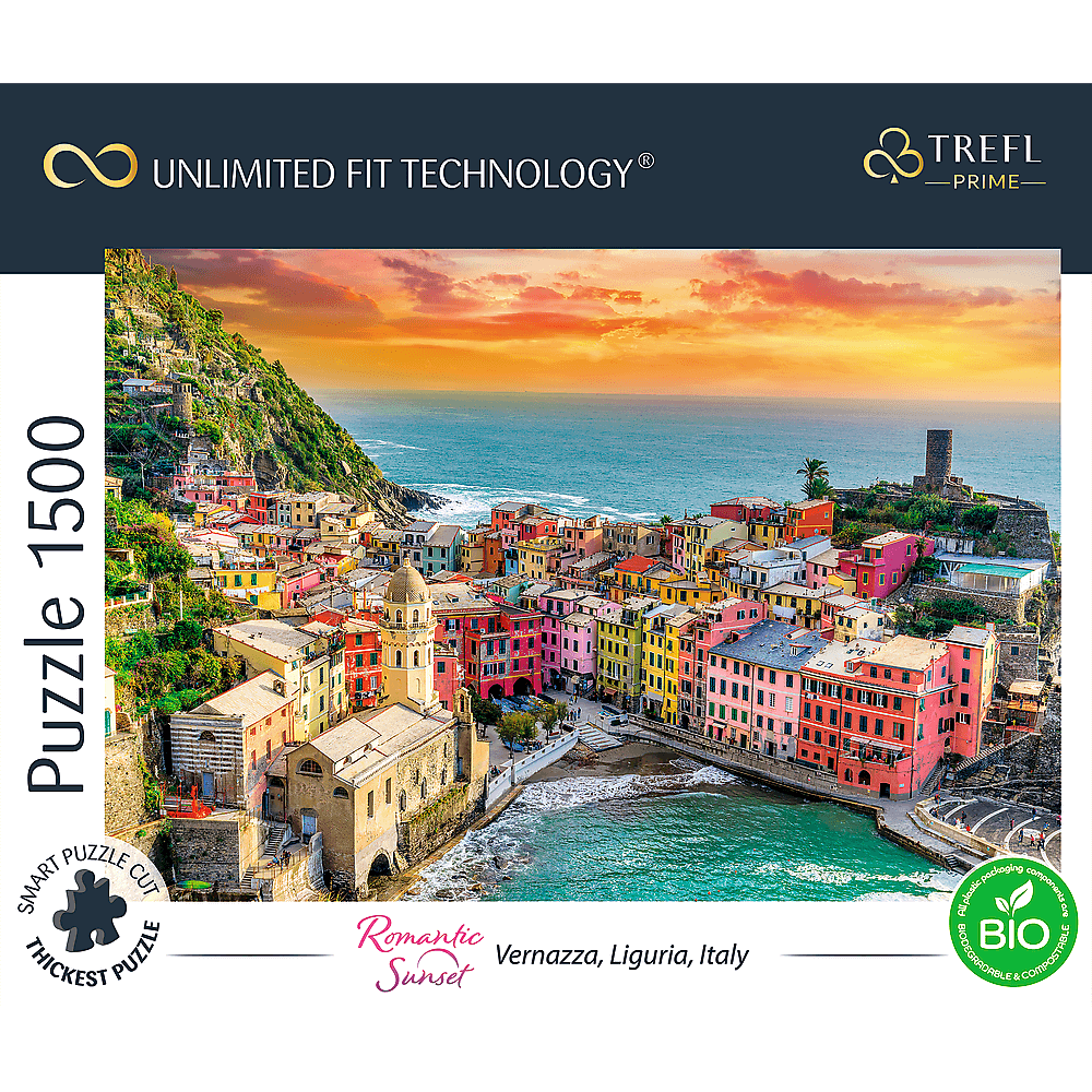 Головоломки з серії Trefl Prime Unlimited Fit Technology, що складається з 1500 елементів, присвячені справжнім любителям головоломки. Головоломка показує вид італійського містечка Вернацца в Лігурії. Після прокладки буде створено зображення розміром 850x580 мм.Головоломки були виготовлені з високоякісних матеріалів, використовуючи найгустіший картон, унікальні форми та спеціальний метод різання. Завдяки цьому ми можемо створити індивідуальний колаж і легко перемістити всю головоломку. Крім того, окремі елементи продукції UFT виготовлені з екологічних матеріалів. Сумка жолоба та наклейки на коробці були виготовлені з біологічно розкладаної фольги. Продукти не загорнуті в теплову фольгу.