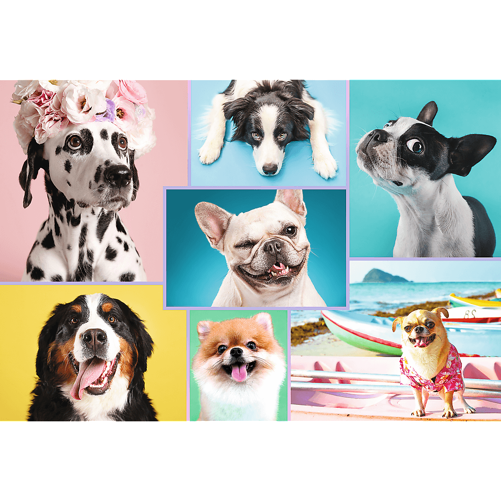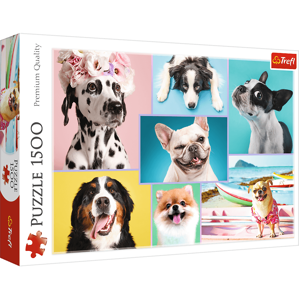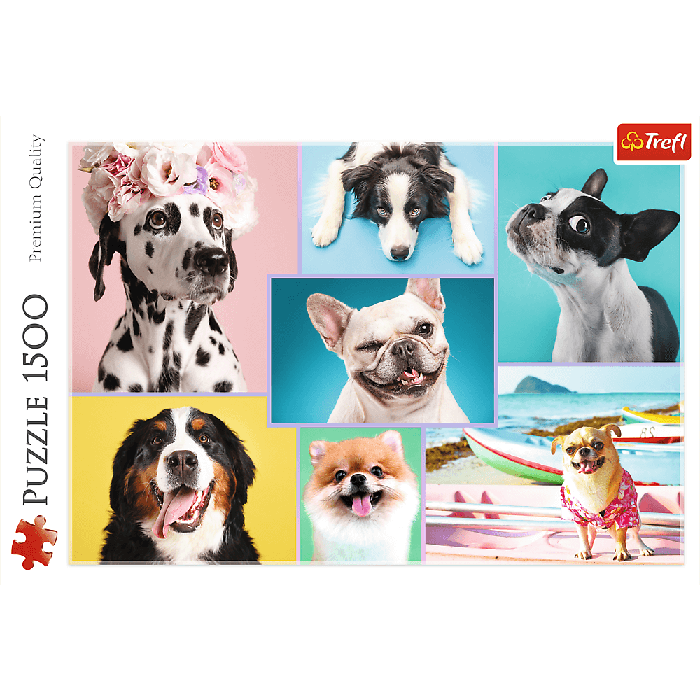 Головоломка, що складається з 1500 елементів із зображенням колажу з солодкими собаками. Після прокладки буде створено зображення з розміром 85x58 см.Продукт був виготовлений з високоякісних матеріалів, використовуючи спеціальний паперовий папір, що відбиває світло, що полегшує проведення. Продукт був виготовлений у Польщі, а екологічні матеріали використовували для виробництва.