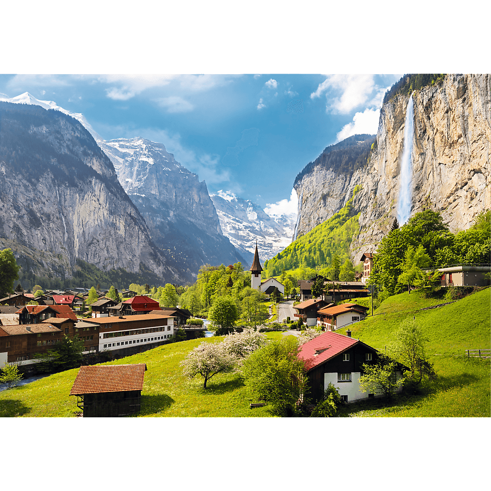Головоломки 3000 елементів, що показують захоплюючий вид на долину та місто Лаутербруннен на півдні Швейцарії. Після прокладки буде створено вражаюче зображення з розмірами 116x85 см. Висока якість, насиченість кольору та безпека укладання забезпечуються папером, що відбиває світло, покрита екологічними харчовими фарбами.