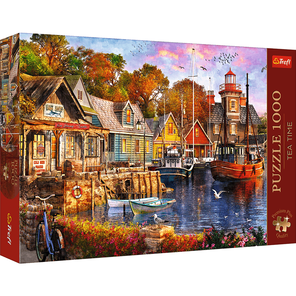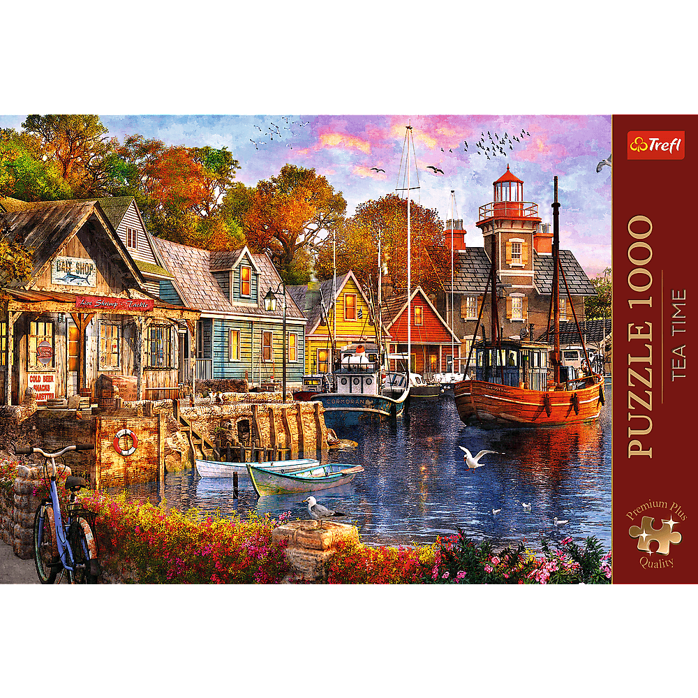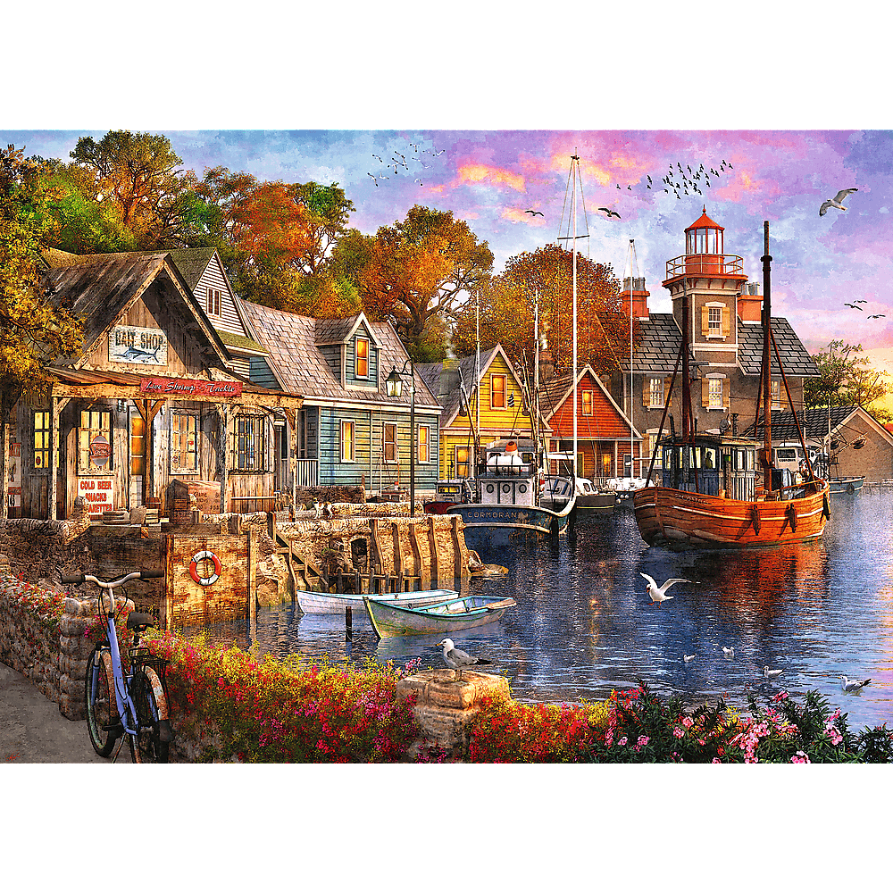 На пазлах Приморський куточок зображена пристань у приморському містечку. Після їх упорядкування буде створено зображення розміром 683x480 мм.