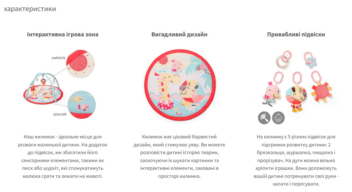 Наш навчальний килимок POOL PARTY був розроблений з думкою про вашу дитину.На ній зображені веселі тварини, які граються в басейні. Святкова атмосфера та яскраві кольори стимулюватимуть уяву вашої дитини. У набір входять привабливі тематичні підвіски, які надовго привернуть увагу малюка і принесуть йому задоволення.