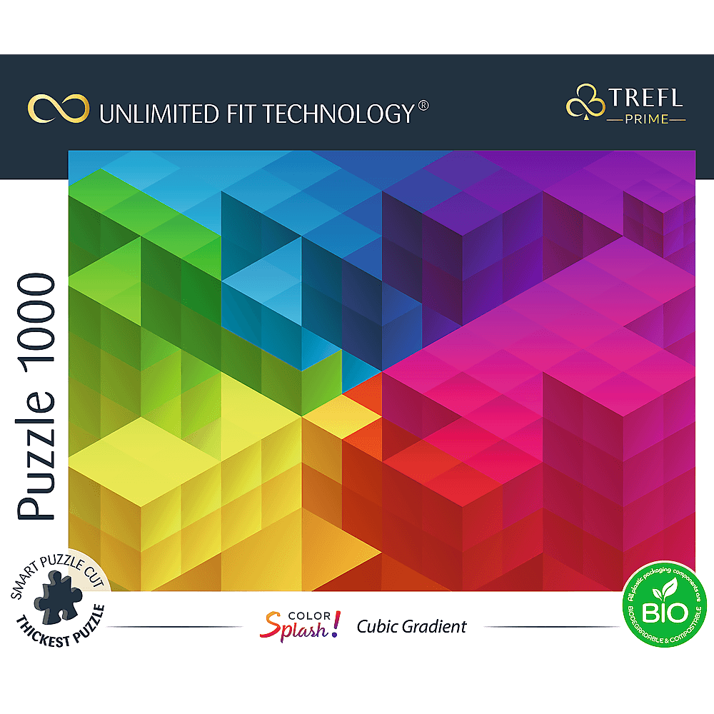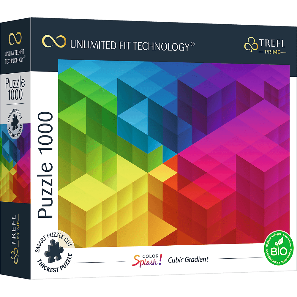 Головоломки з серії Trefl Prime UFT, що складається з 1000 елементів, присвячені справжнім любителям головоломки. Головоломки зображені абстрактним кубічним градієнтом. Після прокладки буде створено зображення з розміром 683x480 мм.Головоломки були виготовлені з високоякісних матеріалів, використовуючи найгустіший картон, унікальні форми та спеціальний метод різання. Завдяки цьому ми можемо створити індивідуальний колаж і легко перемістити всю головоломку. Крім того, окремі елементи продукції UFT виготовлені з екологічних матеріалів. Сумка жолоба та наклейки на коробці були виготовлені з біологічно розкладаної фольги. Продукти не загорнуті в теплову фольгу.