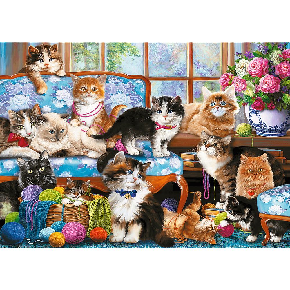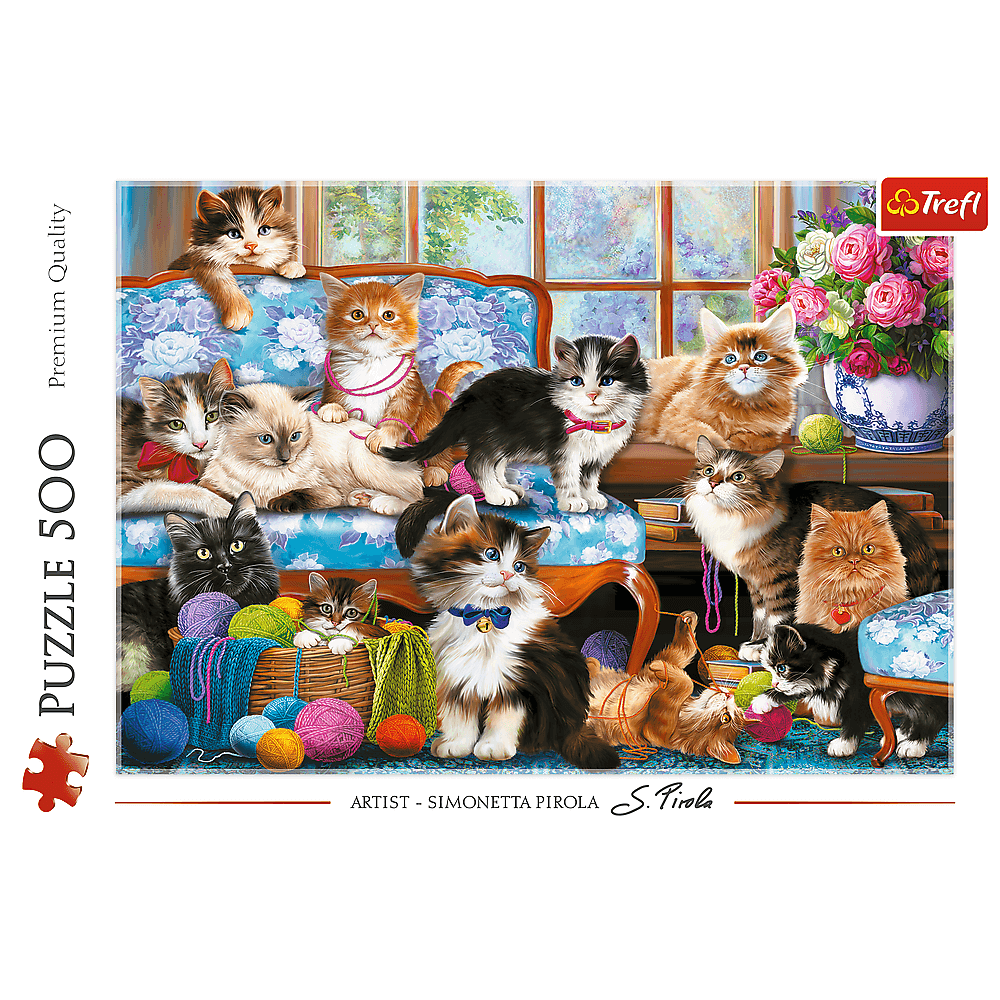 Головоломка 500 елементів зображують велику, котячу родину. Після прокладки буде створено зображення з розмірами 48х34 см. Висока якість, насиченість кольорами та безпека укладання забезпечуються папером, що відбиває світло, покрита екологічними харчовими фарбами.
