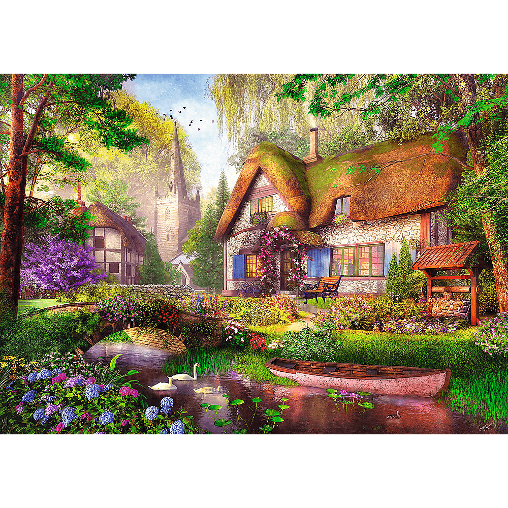 Пазл «Чарівна хатинка в лісі» представляє чудовий будиночок на березі річки. Після їх упорядкування буде створено зображення розміром 683x480 мм.
