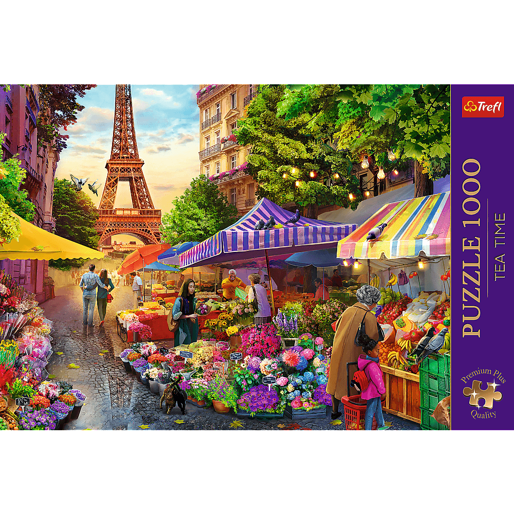 Пазли «Квітковий ринок, Париж» представляють паризьку вулицю з квітковим ринком і Ейфелевою вежею на задньому плані. Після їх упорядкування буде створено зображення розміром 683x480 мм.
